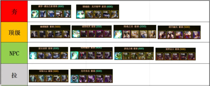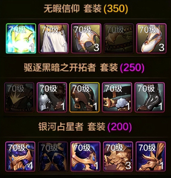 (PS:70版本总共有15套防具,其中3套“信仰套、开拓者、银河套”为辅助套姑且不计算在内)